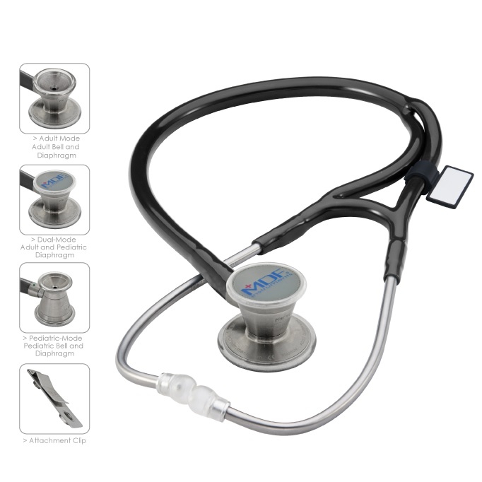 Modell med dubbelhuvud, klassiskt läkarstetoskop med rostfritt stål. Ultrakänsligt membran som ger överlägsen högfrekvensförstärkning. 797-serien är MDFs flaggskeppsserie. Critical Cardiac Care Edition är ett kardiologiskt stetoskop av absolut högsta klass.